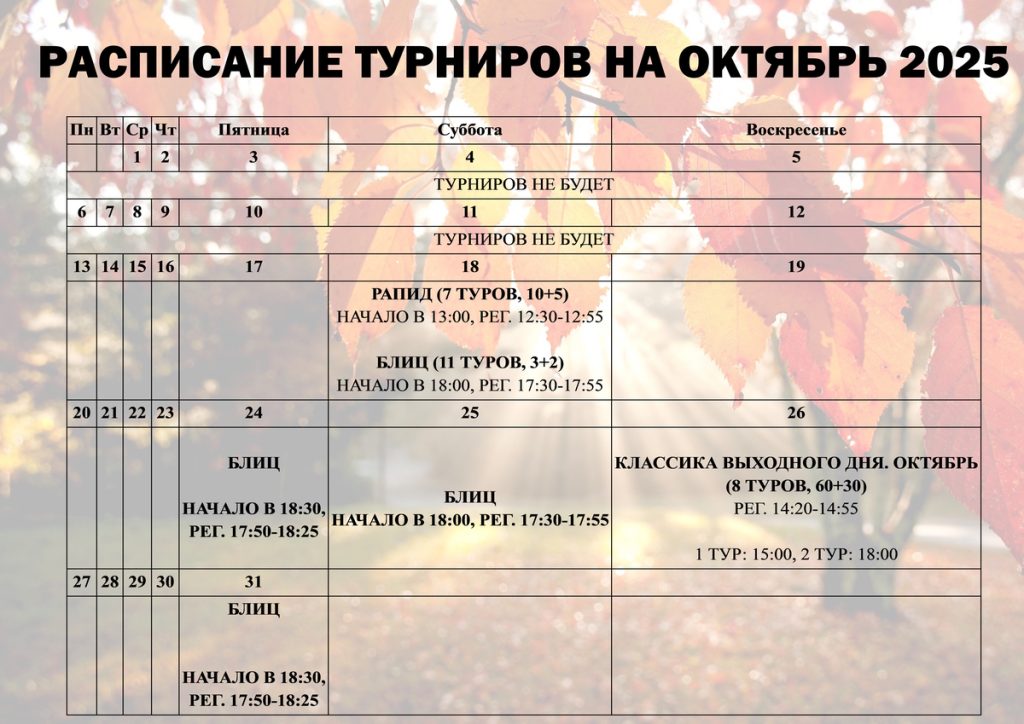 Турниры по РАПИДУ (7 туров, 10+5) состоится 18 октября в 13:00. Регистрация — с 12:30 до 12:55.