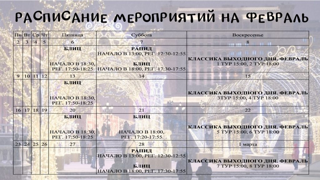 Турнир «Классика выходного дня» (8 туров, 60+30) проводится с 8 февраля по 1 марта. Регистрация — 8 февраля с 14:30 до 14:55. Начало всех игровых дней — в 15:00.
