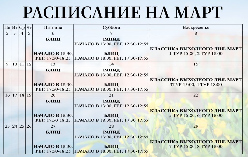 БЛИЦ (11 туров, 3+2) проводится 6, 13, 20 и 27 марта в 18:30. Регистрация — с 17:50 до 18:25.Также БЛИЦ пройдет 7, 14, 21, 28 марта в 18:00. Регистрация — с 17:20 до 17:55.
