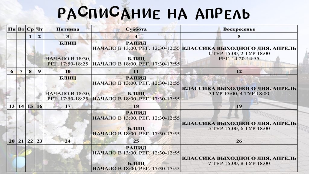 БЛИЦ (11 туров, 3+2) пройдет 3 и 10 апреля в 18:30. Регистрация — с 17:50 до 18:25. Также БЛИЦ проводится 4, 11, 18 и 25 апреля в 18:00. Регистрация — с 17:20 до 17:55.