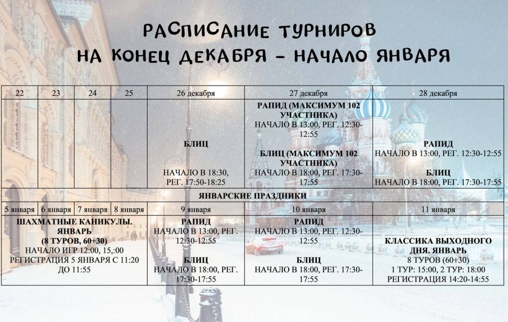 9 и 10 января состоятся турниры по РАПИДУ (начало — в 13:00, регистрация — с 12:30 до 12:55) и БЛИЦУ (начало — в 18:00, регистрация — с 17:30 до 17:55).